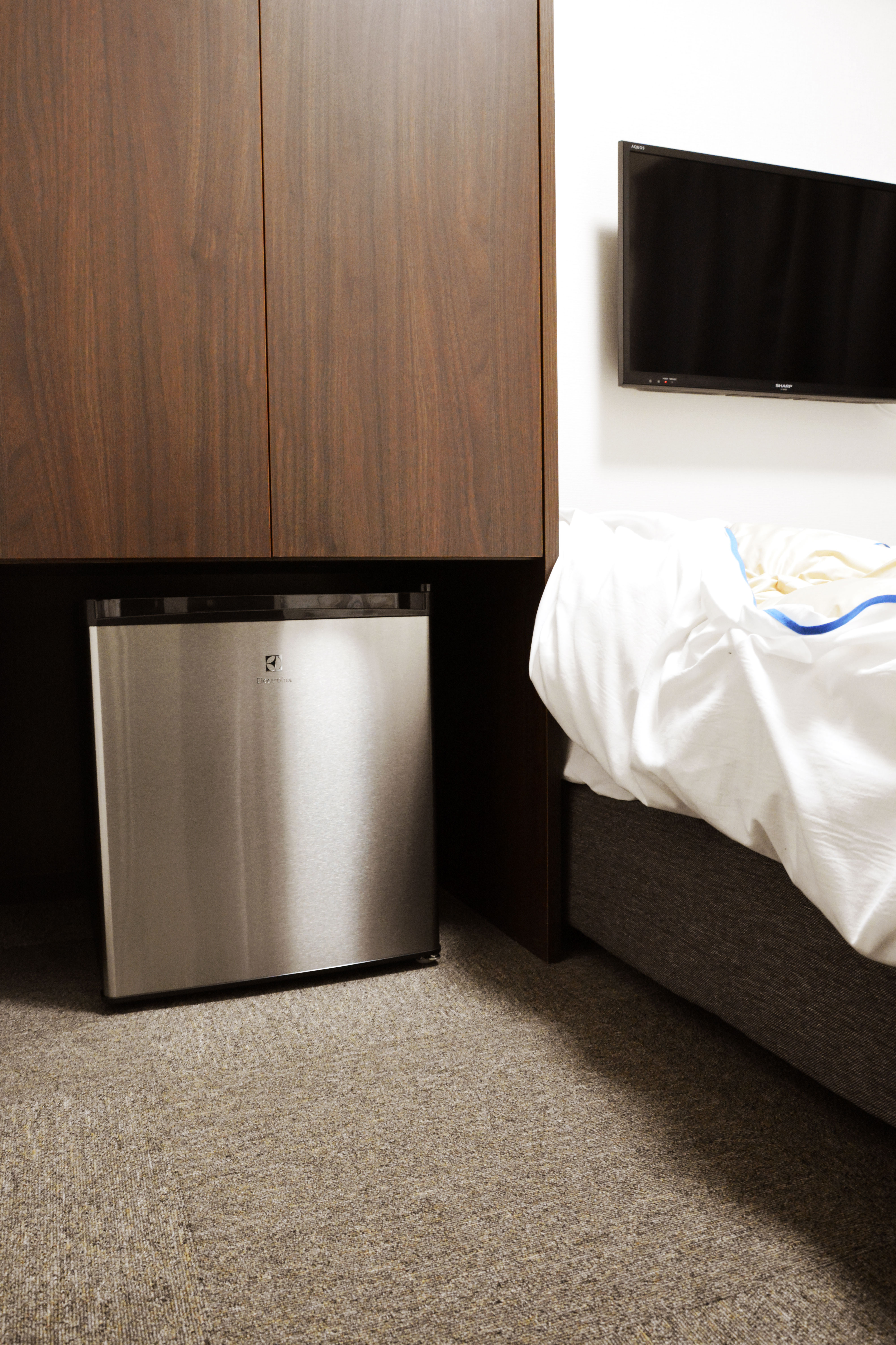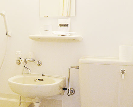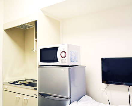 | シングルルーム | ユニットバス、トイレ*1、ミニキッチン、エアコン、2ドア冷蔵庫、テレビ(地上波・BS)、DVDプレイヤー*2、電子レンジ、ドライヤー、電気ポット、ベッド、ベッド下収納ボックス、デスク、チェア |